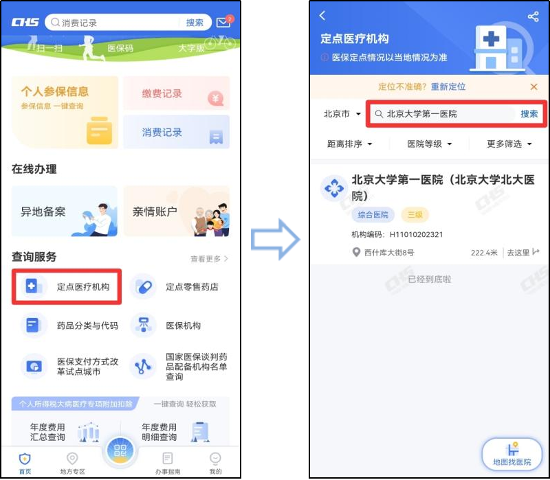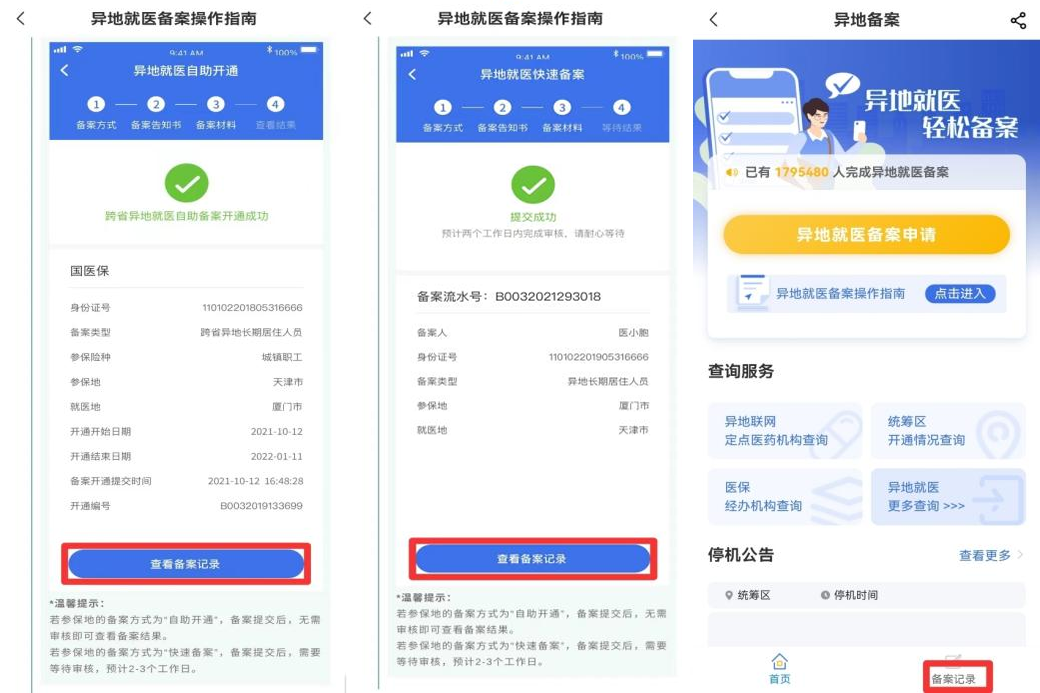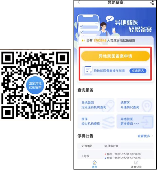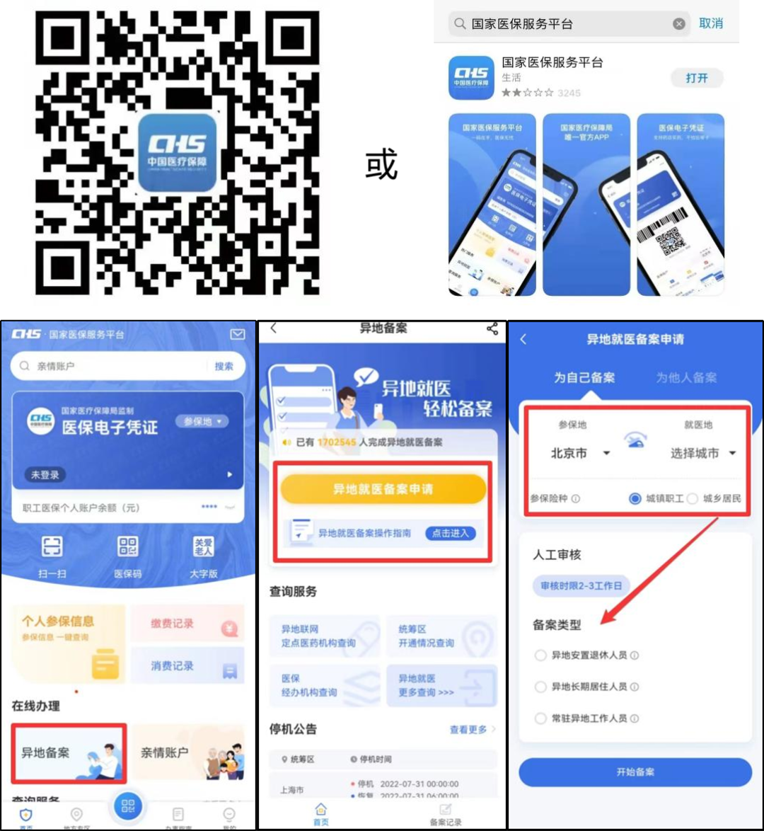 按照国家医保局统一部署,北京大学第一医院门诊及住院均可实现异地医保实时结算服务,为方便您报销顺利,我们总结了一些您可能关心的问题。 一. 办理备案 01 我可以申请异地就医备案吗? 以下参保人员办理异地就医备案后,可以享受跨省异地就医直接结算服务: 包括异地安置退休人员、异地长期居住人员、常驻异地工作人员等长期在参保省、自治区、直辖市以外工作、居住、生活的人员。 包括异地转诊就医人员,因工作、旅游等原因异地急诊抢救人员以及其他跨省临时外出就医人员。 02 如何办理异地就医备案? 您需要首先在参保地医保经办机构办理异地就医备案手续,具体可咨询参保地医保部门。目前全国大部分地区已经开通网上异地备案,可通过“国家医保服务平台”APP、“国家异地就医备案”微信小程序、各地医保部门等渠道申请备案。 可扫描下方二维码,或登录手机应用市场下载“国家医保服务平台”APP。登录后点击“异地备案”进行操作。 ![]() 可在微信小程序搜索“国家异地就医备案”,进入后点击“异地就医备案申请”。 ![]() 您可以咨询参保地医保部门查询备案结果,或者通过“国家医保服务平台”APP、“国家异地就医备案”微信小程序,线上查询。 登录“国家医保服务平台”APP或“国家异地就医备案”微信小程序,提交备案材料后,点击“查看备案记录”或点击“备案记录”,均可查询异地就医备案状态。 提示:根据备案方式要求不同,审核时间不同: “自助开通”备案提交后无需审核即可查看备案结果; “快速备案”备案提交后,需要等待审核,预计2-3个工作日。 登录“国家医保服务平台”APP或“国家异地就医备案”微信小程序,点击异地备案——异地联网定点医药机构查询——搜索某医院名称,如“北京大学第一医院”,即显示异地就医住院、门诊、门诊慢特病的开通情况。 ![]() 目前,我院已开通普通门诊、急诊、住院异地就医实时结算,暂未开通急诊留观、门诊特殊病慢性病异地就医实时结算。03 北京大学第一医院医疗机构编码 北京大学第一医院医疗机构编码为H11010202321。可登录“国家医保服务平台”APP,在“查询服务”中点击“定点医疗机构”,搜索医院名称即可查询。 ![]() “国家医保电子凭证”与实体社保卡一样,也可用于异地就医结算报销。 如果您未随身携带社保卡,也可以通过国家医保服务平台、国家政务服务平台、国务院客户端或经由国家医保局授权认证的第三方渠道,如支付宝、微信等,搜索“国家医保电子凭证”并申领。 老人、儿童等不便使用智能手机激活“国家医保电子凭证”者,可以在“国家医保服务平台”APP中,由亲属通过添加亲情账户的方式代为领取“国家医保电子凭证”。02 异地医保报销比例是多少? 异地医保报销,执行“就医地目录、参保地待遇”,即按照北京市医保报销的规定,执行北京医保药品目录、医疗服务项目、医用耗材目录。具体报销比例、起付线、最高支付限额等政策,由参保地决定。如果您对此有相关疑问,可以咨询参保地医保部门。03 使用异地医保卡,如何在我院门诊就诊? 如果您享受异地就医门诊实时结算报销: ![]() 首次在我院就诊的患者,可通过“北京大学第一医院”微信服务号,或“北京大学第一医院”支付宝生活号,创建我院电子就诊卡进行首次挂号。挂号后,请于就诊当日前,提前到院,须持已备案的“社保卡/医保电子凭证”先到门诊人工收费窗口激活、医保换号,方可进行医事服务费报销,再行就诊,就诊后的处方费用,也须到人工收费窗口进行实时结算缴费。 第一次就诊在人工窗口进行医保卡激活后,可将异地备案的社保卡号,绑定到“北京大学第一医院”微信服务号,或“北京大学第一医院”支付宝生活号,以便第二次直接使用所绑定的异地备案社保卡号进行预约挂号。 每次取号、缴费时,均须在人工收费窗口进行医事服务费报销和处方费用实时结算缴费。(详见“北京大学第一医院”公众号-门诊挂号-挂号须知)。 微信操作流程:使用微信扫一扫下方二维码,关注“北京大学第一医院服务号”➨为您服务➨就诊卡管理➨添加就诊卡➨输入就诊人信息➨完成建卡;就医➨门诊挂号➨选择拟就诊科室➨选择拟就诊日期➨选择医师➨选择号别➨缴费➨预约成功。 支付宝操作流程为:使用支付宝扫一扫下方二维码,关注“北京大学第一医院服务号”➨就诊卡管理➨添加就诊卡➨输入就诊人信息➨完成建卡;挂号缴费➨选择拟就诊科室➨选择拟就诊日期➨选择医师➨选择号别➨缴费➨预约成功。 异地医保患者请务必在人工收费窗口取号和缴费。 急诊留观属于急诊范围,按照北京市财务规定出具门急诊发票,无法提供住院发票。相关报销问题,请您咨询参保地医保部门。 门诊直接结算系统建设等工作在不断完善和优化中,就医过程中可能会出现无法直接结算的情况。如无法完成直接结算,我们会及时协调相关部门进行解决;如仍无法解决,请您及时联系参保地医保经办机构,确定本次就医费用是否可以按原有报销渠道手工报销。 手工报销所需材料请以您当地医保经办机构要求为准。 门诊病历、诊断证明:门诊电子病历由医生书写,就诊结束后可向医生要求打印。就诊结束后,可向医生要求开取仅供异地医保报销用“诊断证明”,持该证明到一层大厅中间的门诊服务台