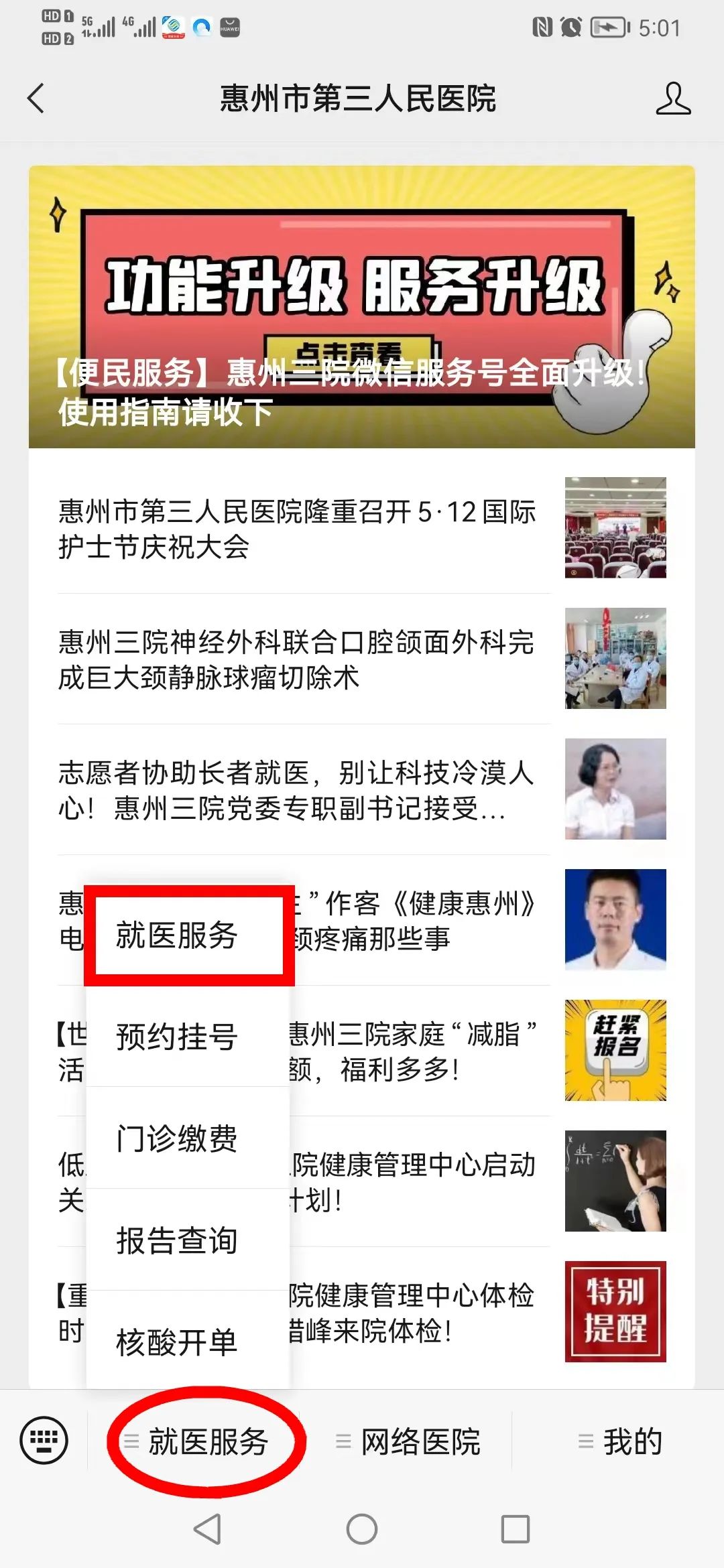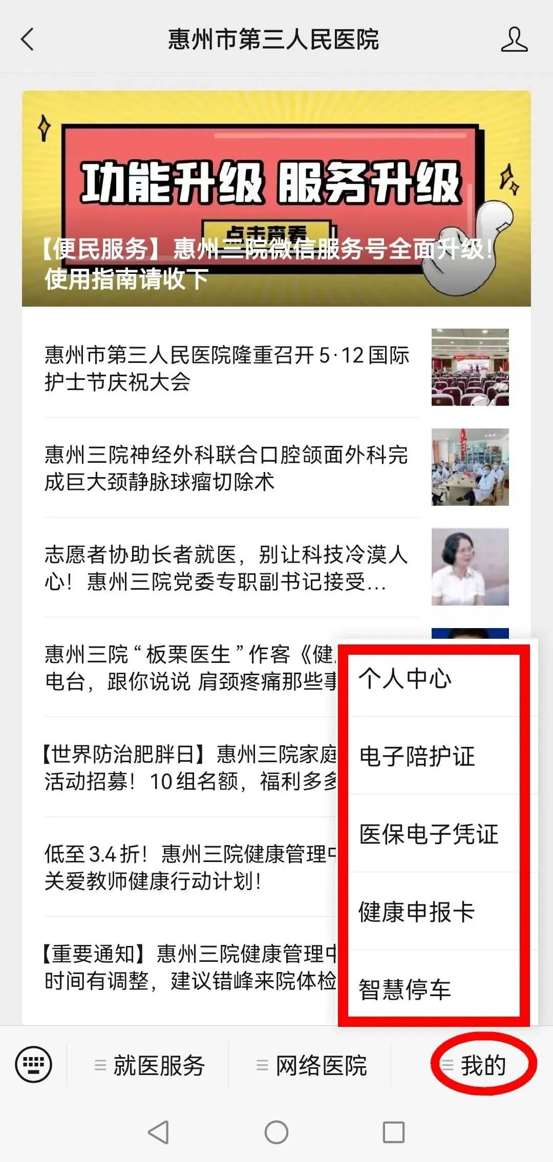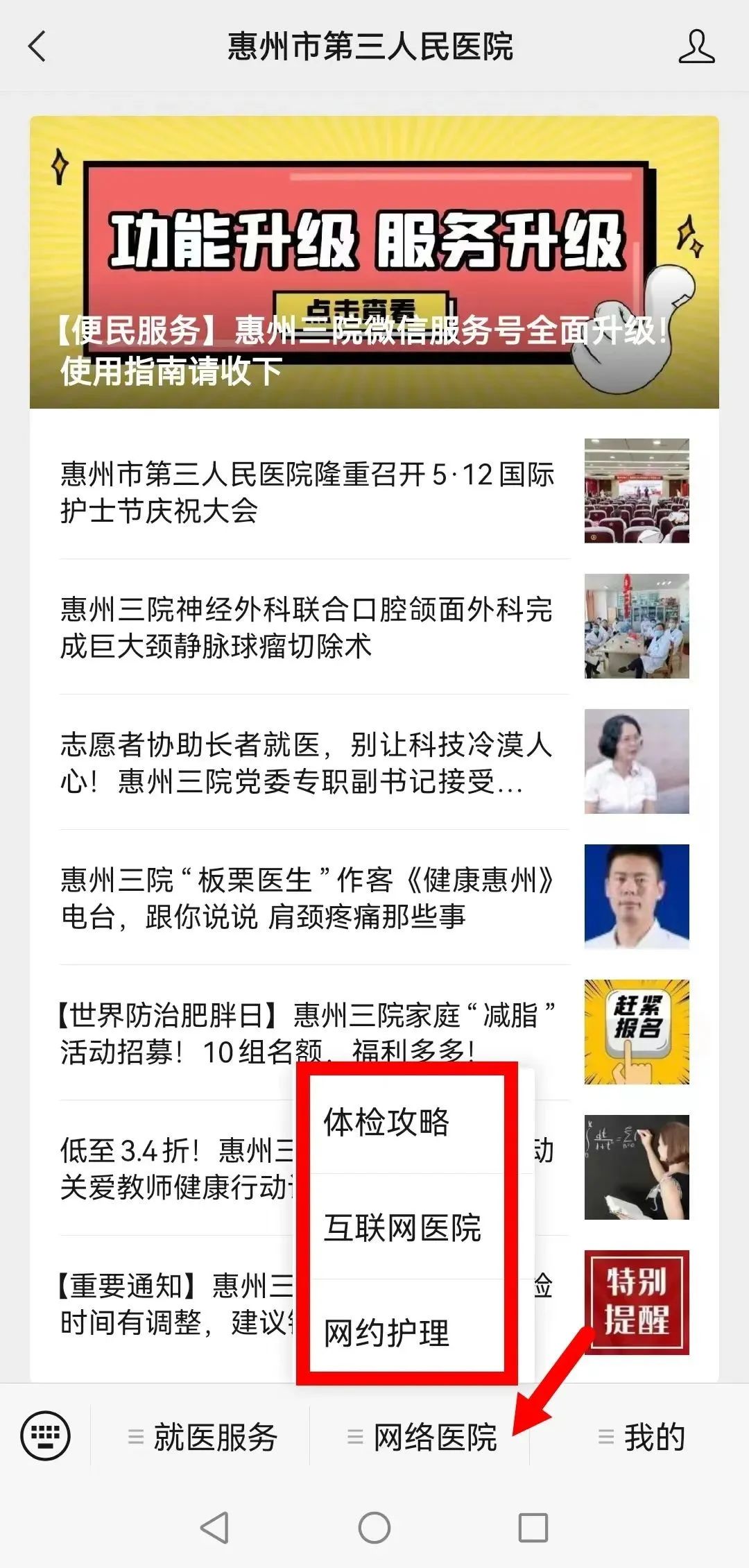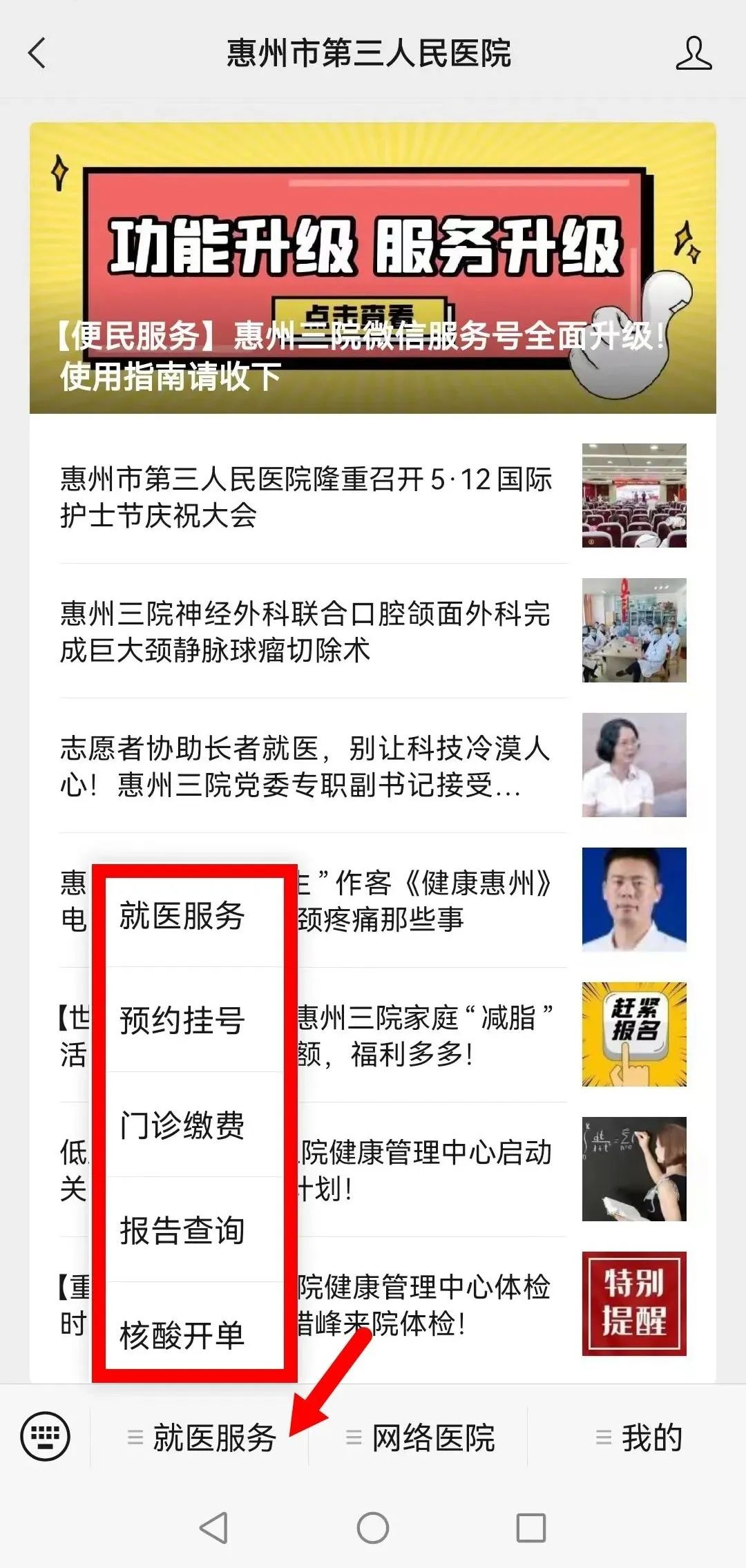 升级后的服务号主菜单栏设置就医服务、网络医院、我的三大版块