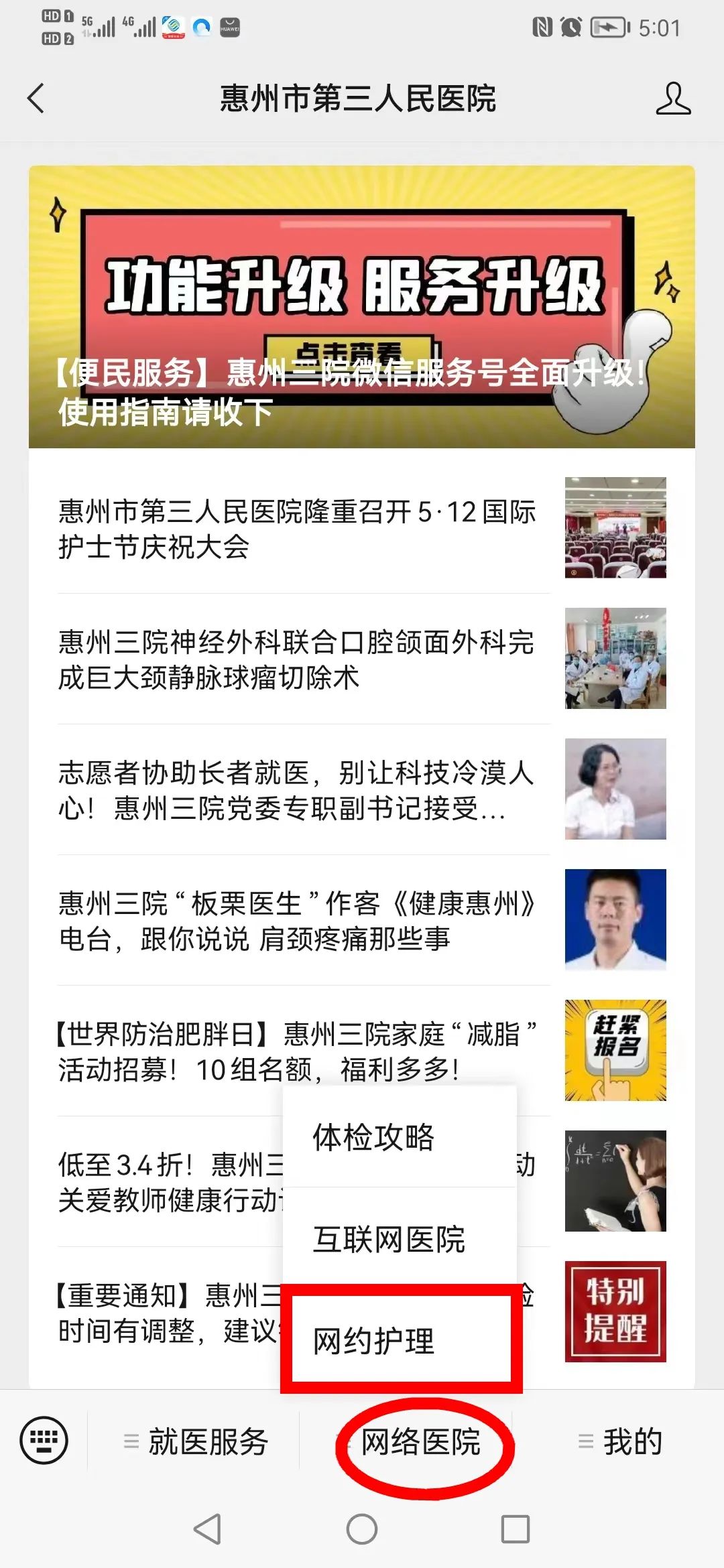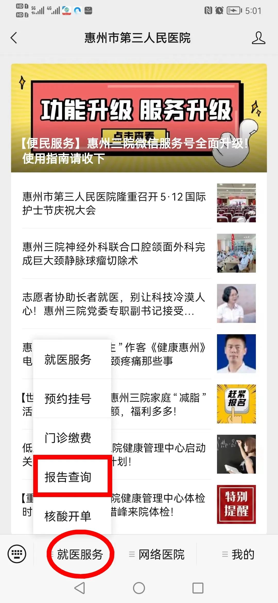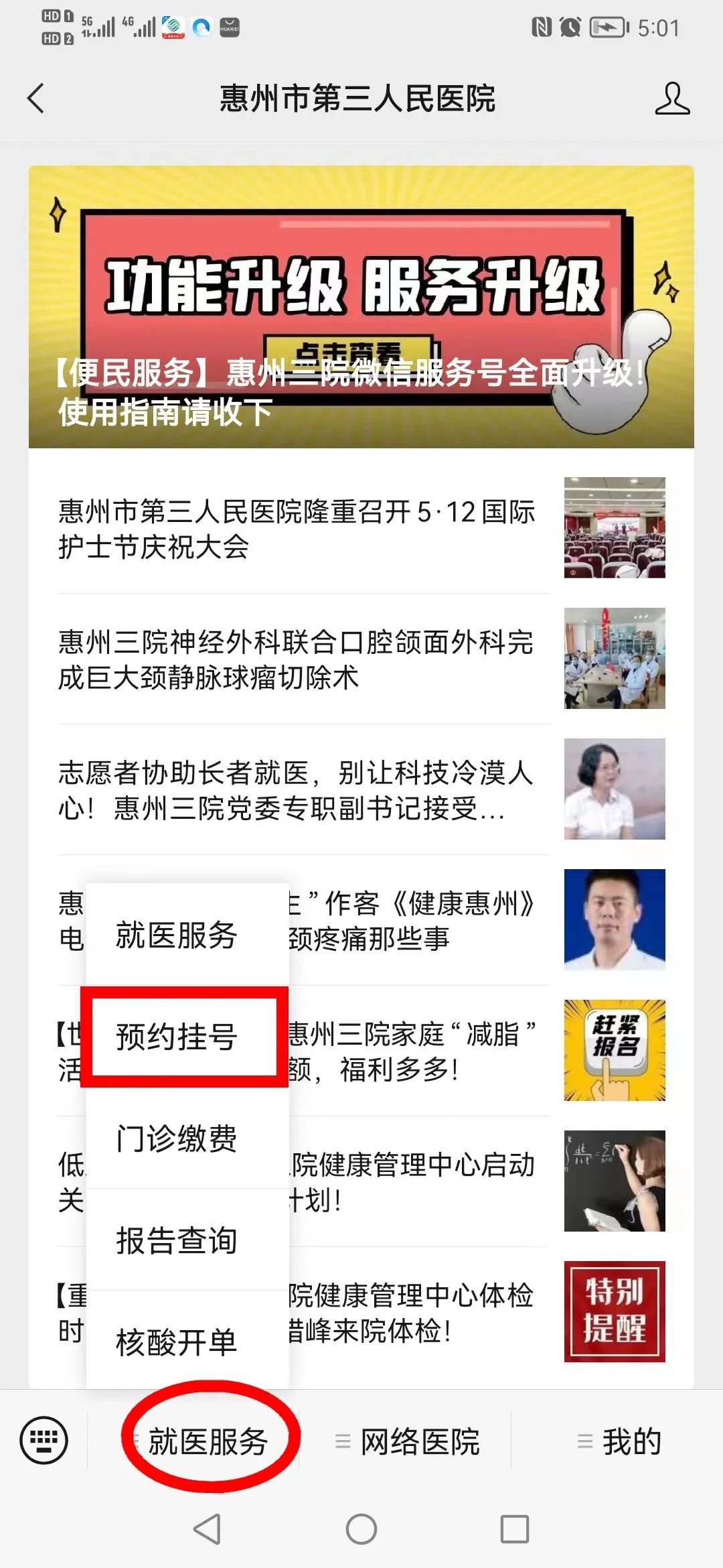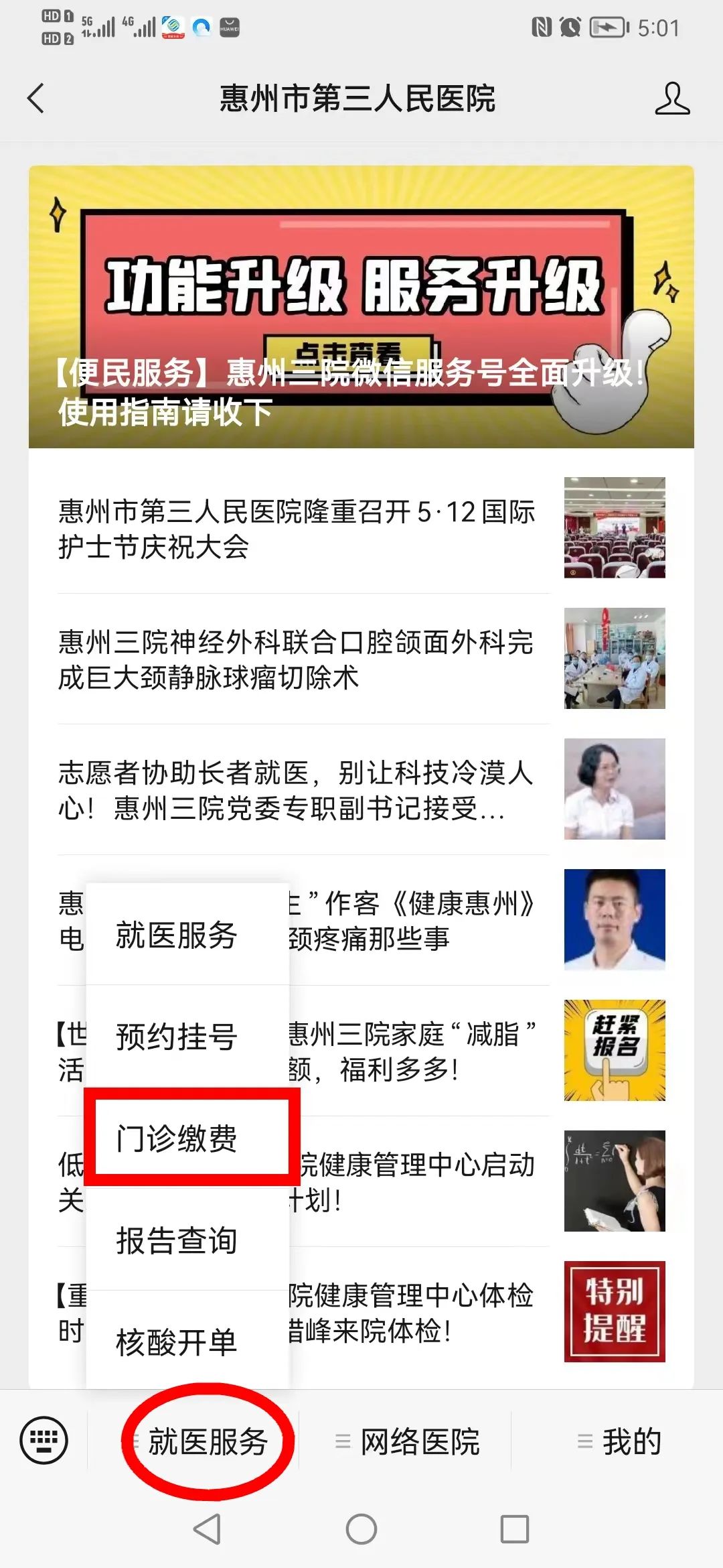 升级后的服务号主菜单栏设置就医服务、网络医院、我的三大版块