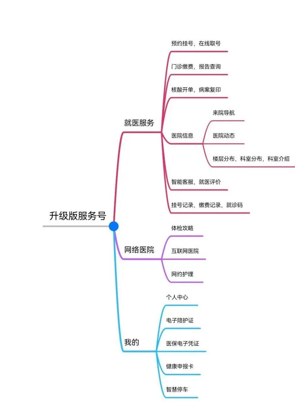 线上建卡、预约挂号、在线取号、门诊缴费、报告查询、核酸开单、智慧停车、网约护理、病案复印等