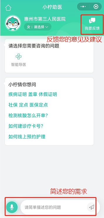 1.在“就医服务”界面进入“智能客服”,简述您的需求即可。