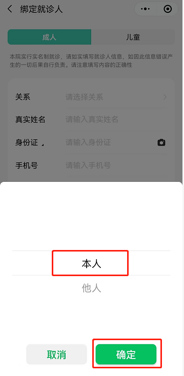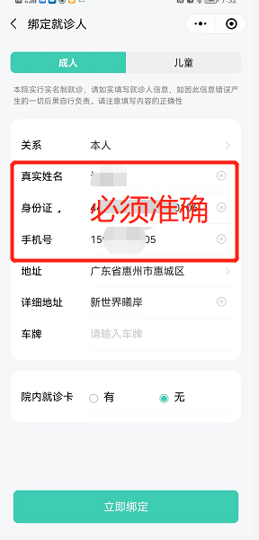 1.如是新增的就诊人,在我院原有就诊卡的,在“院内就诊卡”栏内选择“有”,并确保姓名及身份证号准确无误,才能成功绑定。