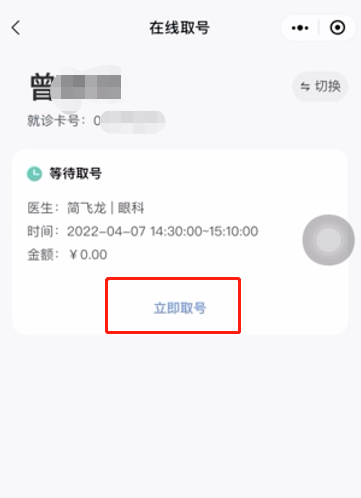 升级后的服务号开放在线取号功能:点击【就医服务】→【在线取号】→【立即取号】→取号成功。