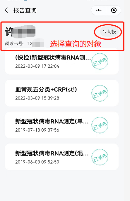 点击【就医服务】→【报告查询】→【选择报告查询对象】→【查看更多报告】。