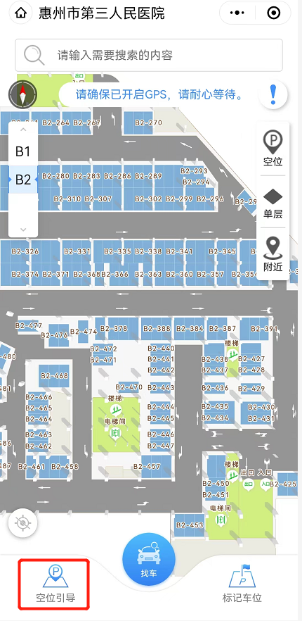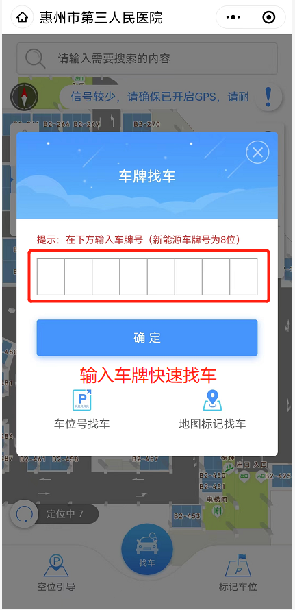 点击【我的】→【智慧停车】→【输入车牌快速找车】、【点击空位指引,快速导航车位】。