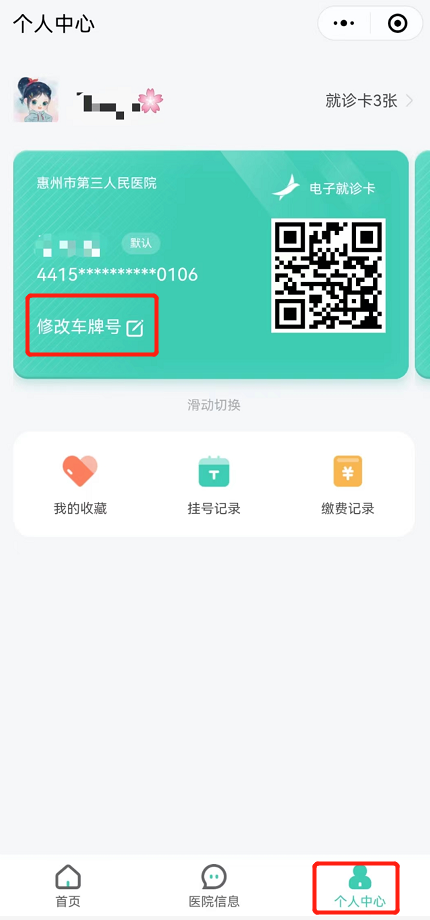 1.绑定及修改车牌号:可在绑卡时输入车牌号或在【个人中心】个人信息中修改车牌号。