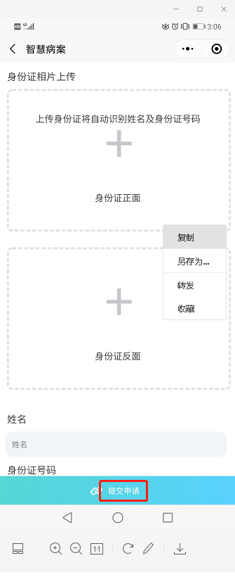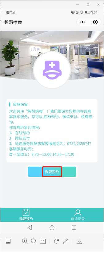 点击【就医服务】→【病案复印】→【我要预约】→【填写资料提交申请】。